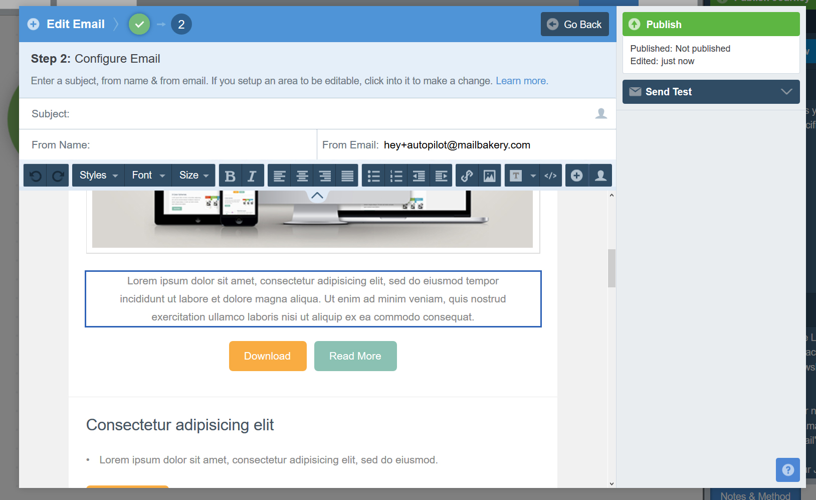 - The Autopilot custom email template editor allows you to edit the content within the sections (title, text, images and buttons).
