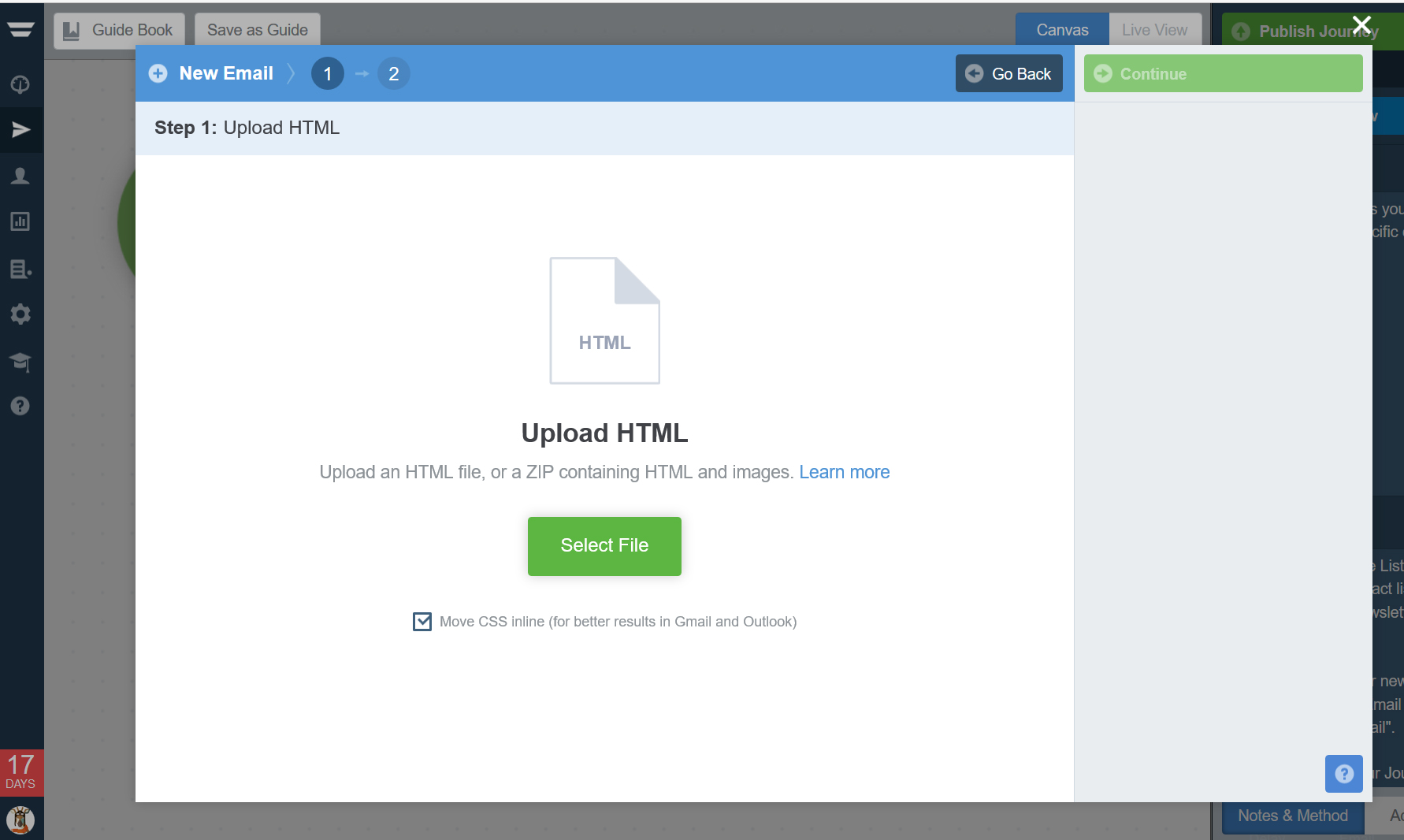 Follow this path: Journeys (LHM) – New Journey – Start from a Guide – Send Your Contacts an Email Newsletter – Use Guide – Send Email Newsletter – New Email – Upload HTML – Continue. Select your .zip file containing the HTML and images and upload them.