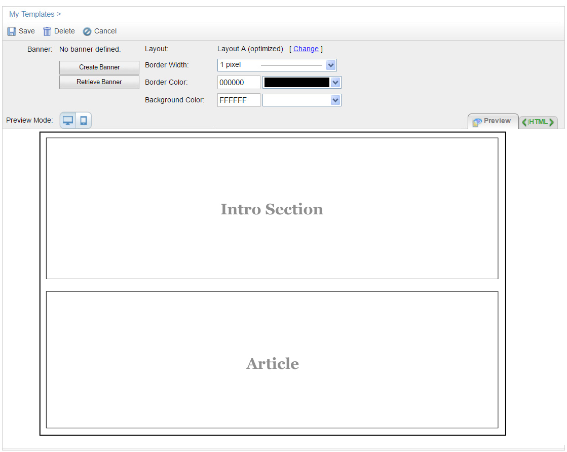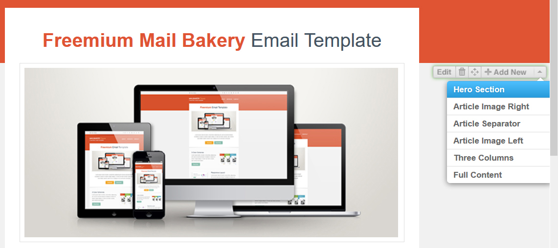 Campaign Monitor’s custom email template editor offers a very wide range of tools that allow you to modify your email template as much as you wish. Your email template is separated into sections called layouts. You have the option to add, remove and switch these sections around, as well as edit the content within the sections (title, text, images, buttons).