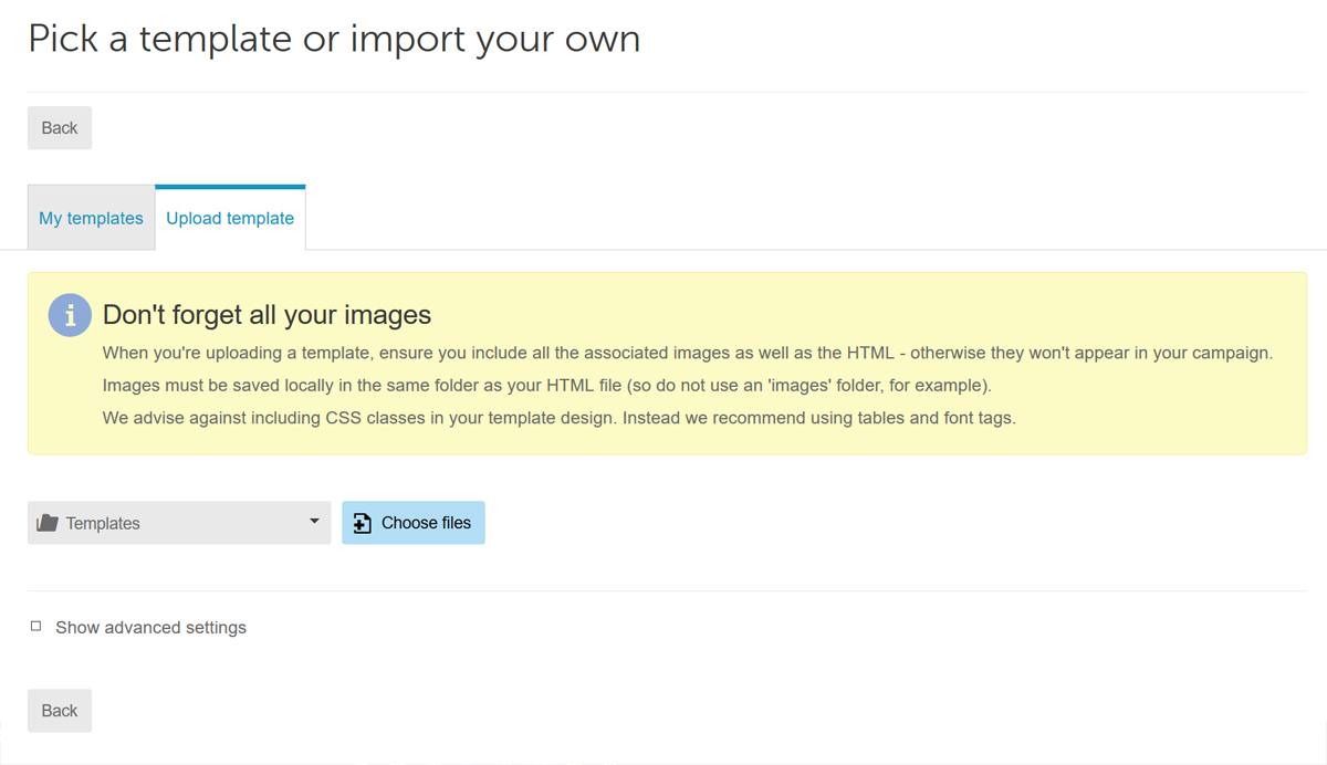You have to upload a .zip file with your HTML code and images. Upload path: Campaigns – My templates – Upload Template.