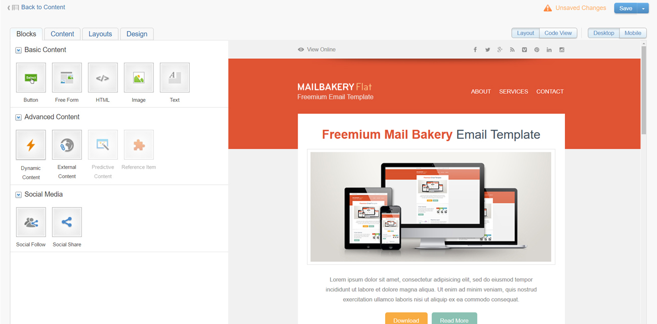 - You can create advanced content – A/B test content, Dynamic Content, Insert content from a URL;