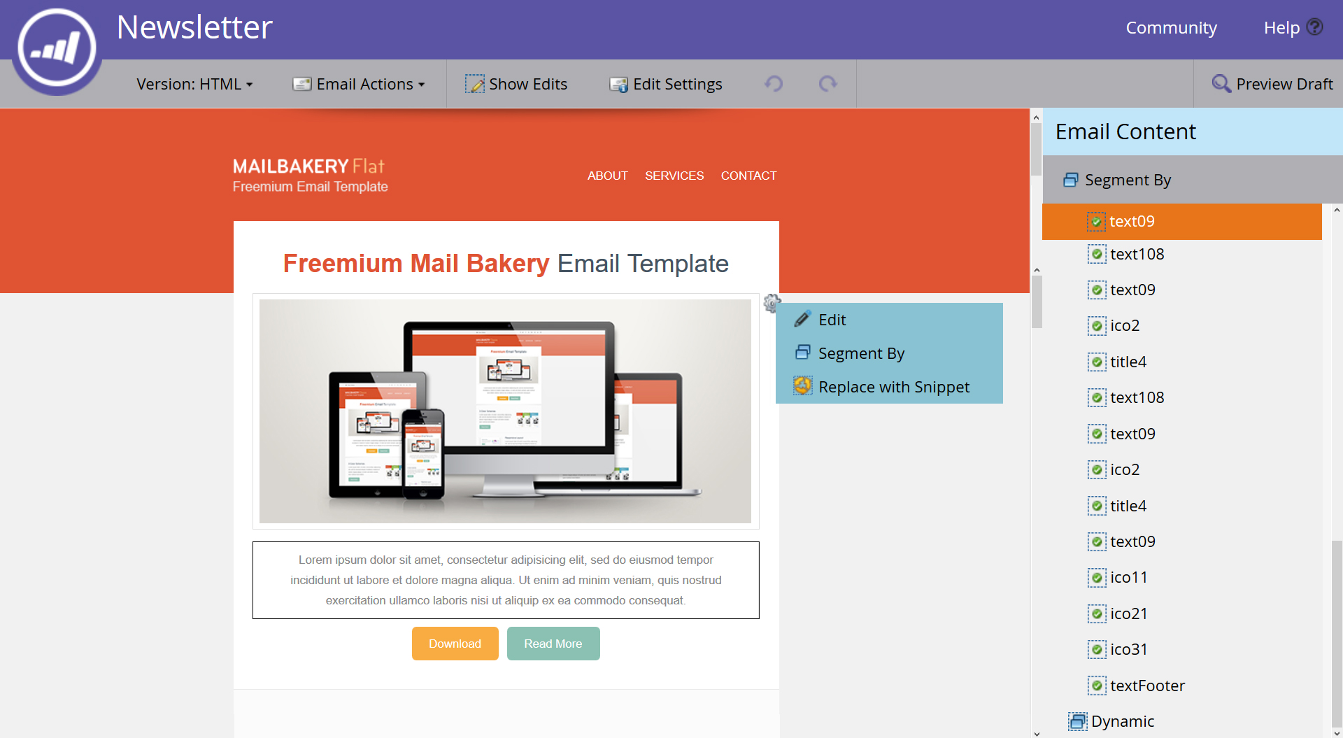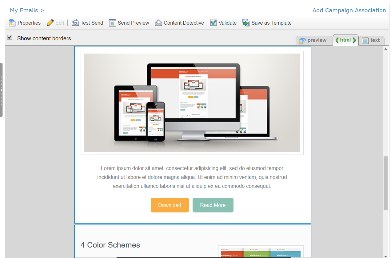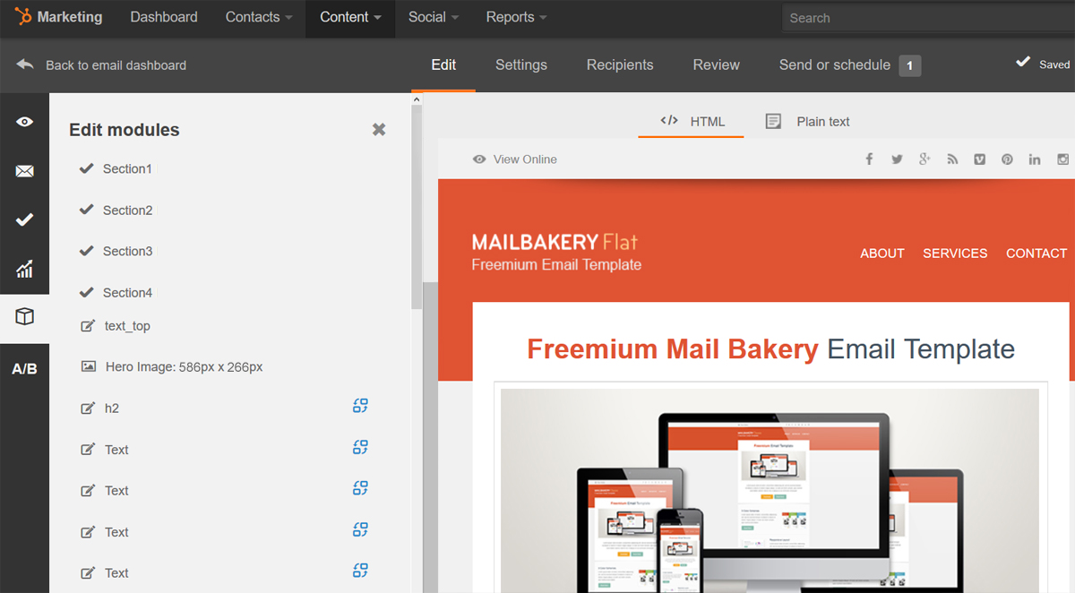 (3) Finally you link each content block HTML file to an email section to get a preview of the email template.