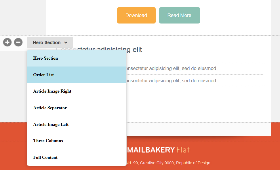 - You can add, Remove and Replace default content blocks (layouts). These are layouts that appear in the email template editor by default;