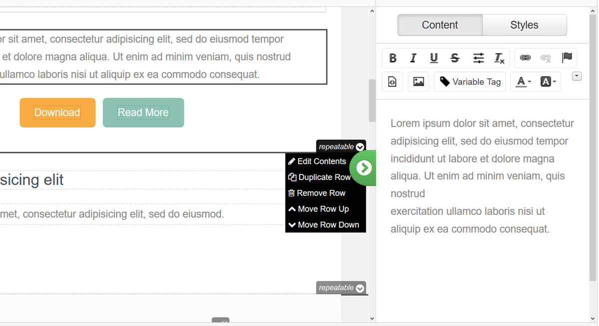 - Function Add (repeat) element. The email template editor allows you to repeat elements within a layout, like bullets, images and buttons.