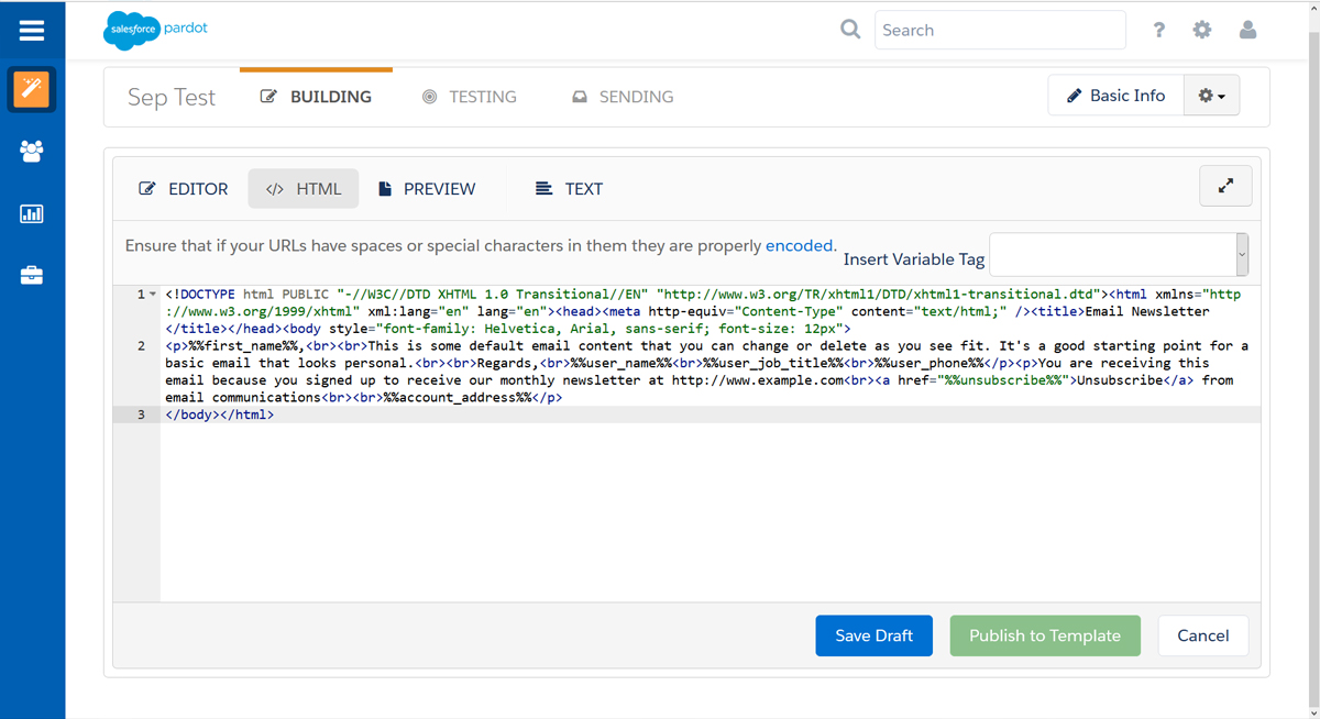 Uploading the HTML code requires that you go through several menus: Content – Email – Create New Email – Create New Template – Code Editor – Email – Choose save location. You can now paste the HTML code in the HTML editor.