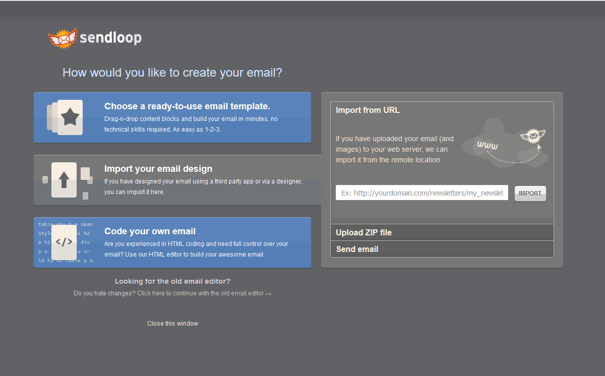 To upload your HTML and images follow this path from the home screen: Send Email – Import your email design. Then you will have the choice to either upload a .zip file or host the files on your own server and let Sendloop import them from there into the email template editor.