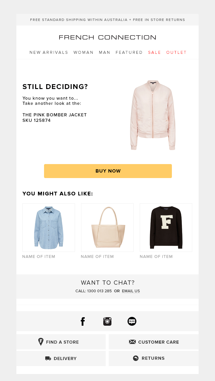 Content/Messaging: Use a slight sense of urgency referring to the product viewed by the shopper and use soft calls to action inviting shoppers back to the site.