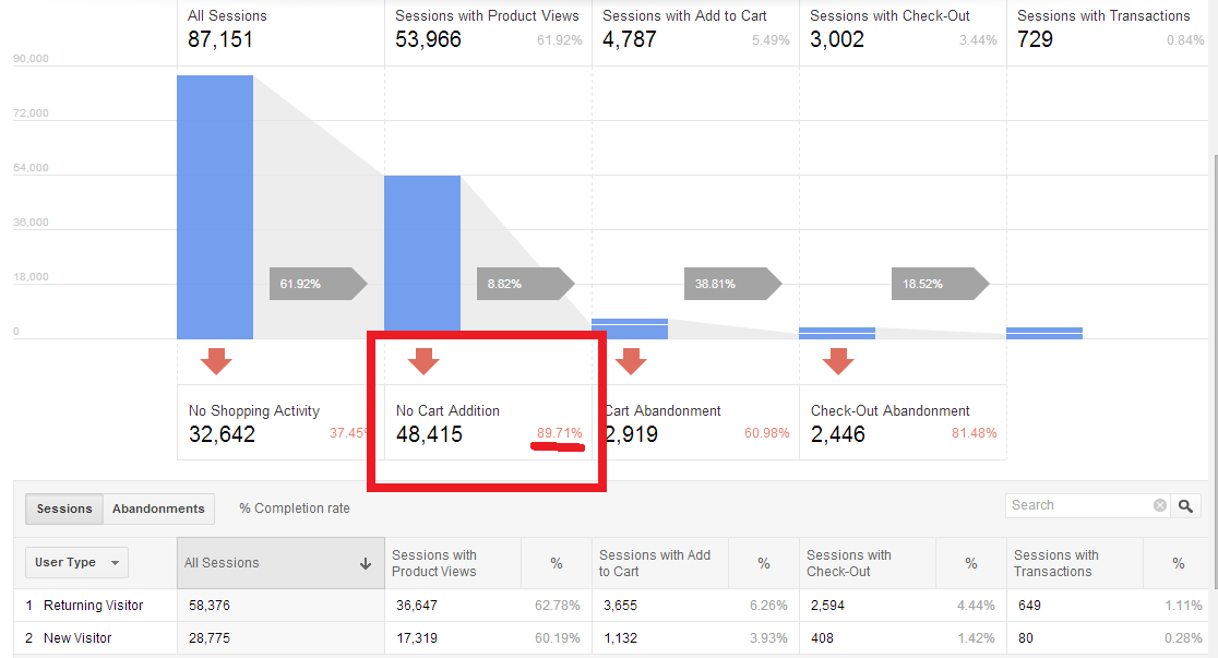 This screenshot paints the picture of what most eCommerce sites experience: the majority of your traffic won’t even add products to a cart!