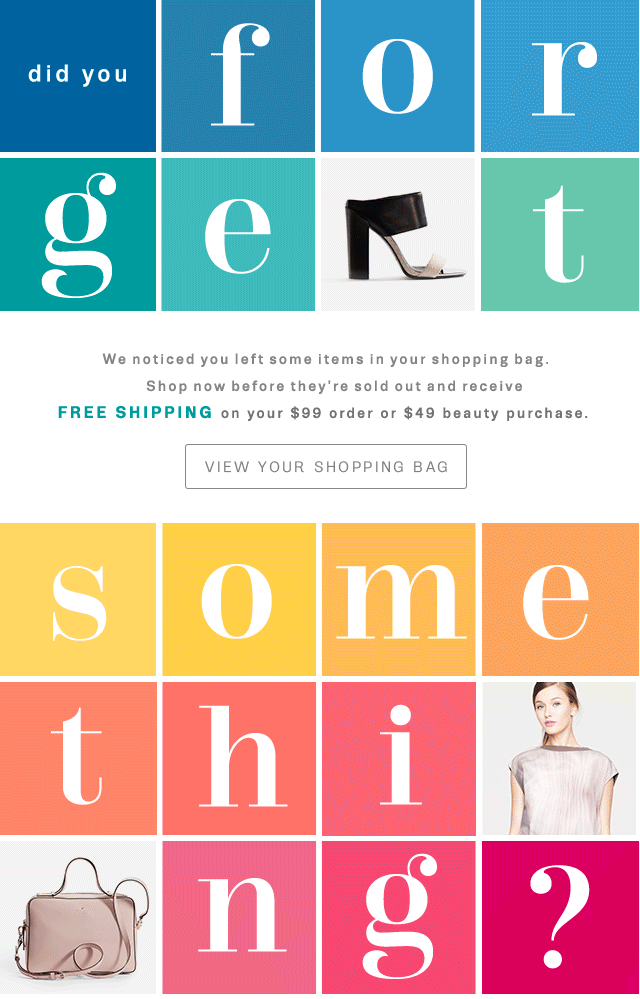 A special one for the GIF lovers. An abandoned cart email from NARS Cosmetics, big and colorful. No specific information about the items left behind, but they give you a free shipping if your purchase is over $99.