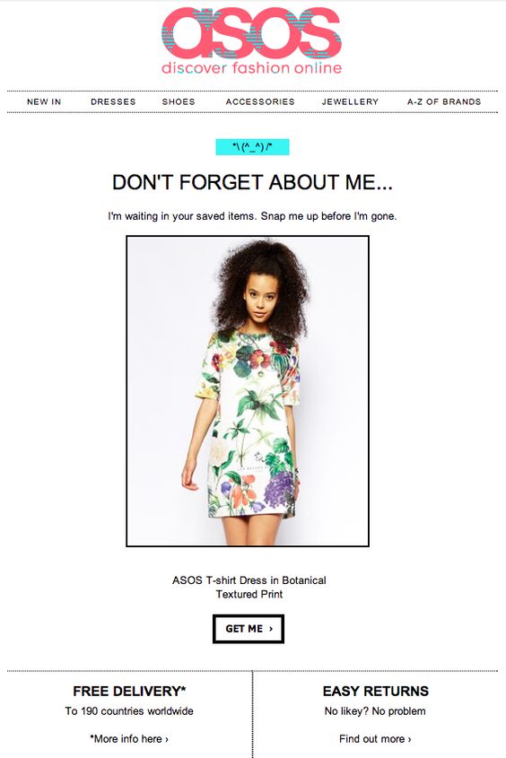 ASOS prefers to show you the exact item you’ve left behind. They start with a Don’t forget about me… message, followed by an image of that summer dress you selected, but you never purchased.