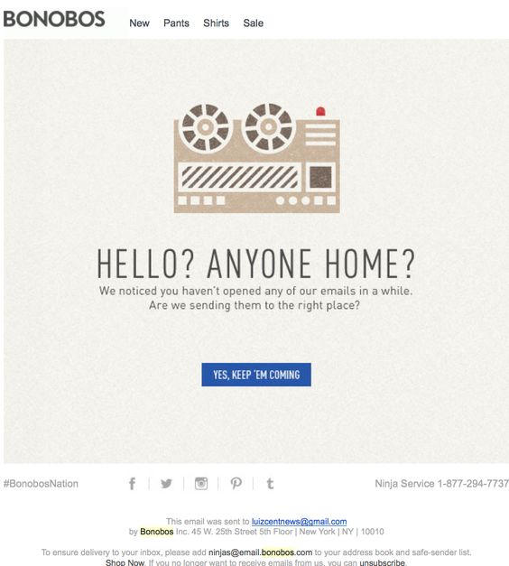 Bonobos’ activation email features an illustration of an old voice recording machine, accompanied by the line Hello? Anyone home? Along with that they are asking for confirmation, if their transactional emails are send to the right email address.