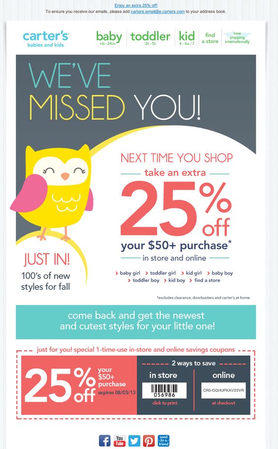 Carter’s say they missed you in a cute way and offer you 25% off next time you shop with them. The colors of this transactional email are very fresh and it features a funny illustration that gives it a very friendly feeling.