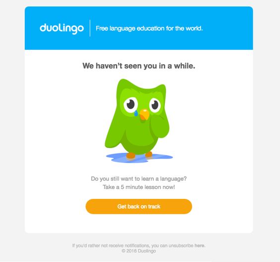 Duolingo reminds its subscribers that they have not attended a lesson on their website for some time. Suggesting that they Take a 5 min lesson right now.