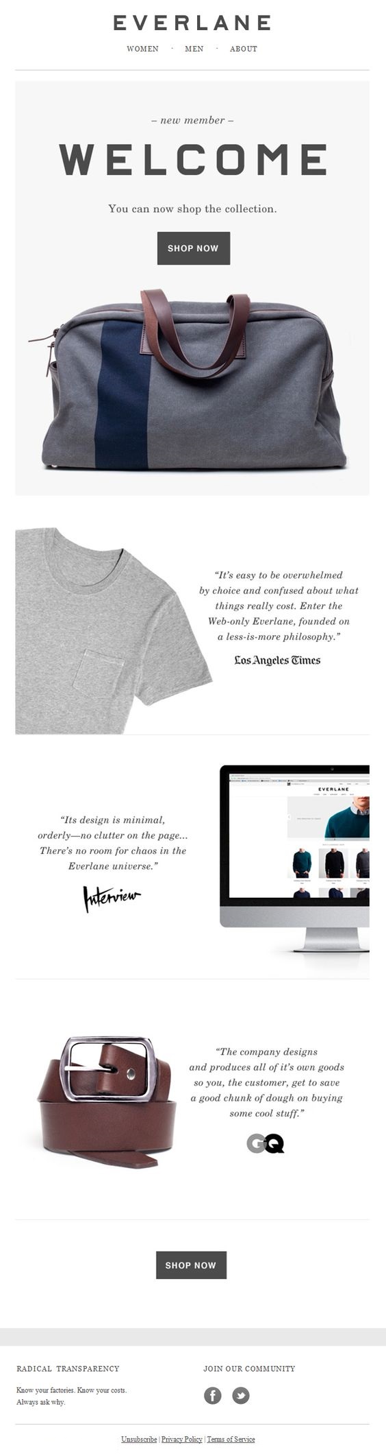 In a clean and stylish design, Everlane combines their welcome message with three, short testimonials and a Shop Now button. There is navigation menu on the top of this transactional email too.