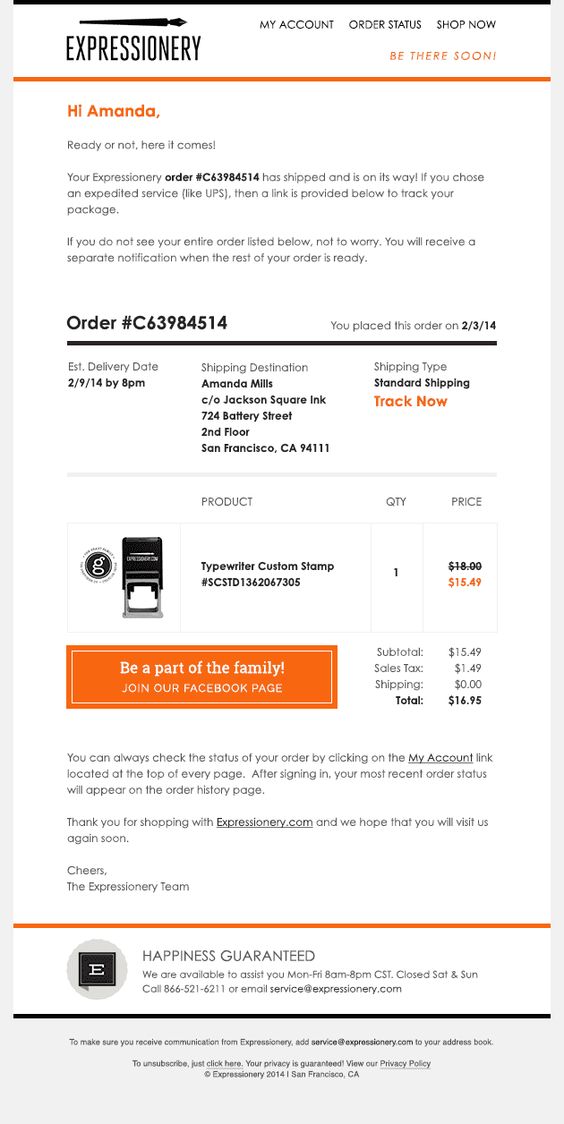 A confirmation email sample from Expressionery, displaying the item information, but featuring also a big orange button prompting the recipient to join their Facebook page.