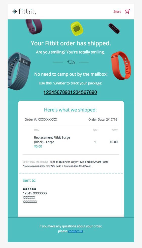 The Fitbit order confirmation email is short and to the point. It features Fitbit’s products hovering on top, plus information about the item that has been shipped.