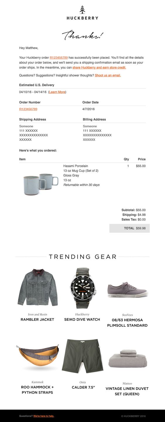 Here is a transactional email for order confirmation from Huckberry. Along with the order number and details for the purchased item, the email features a trending gear section.