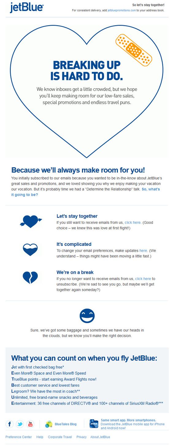 jetBlue send this email when they feel things are not working well between them and a client. They know Breaking up is hard to do, but they don’t want to intrude into the client’s inbox, sending unwanted emails.
