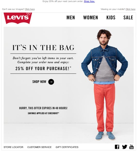 Levi’s reminds you about the purchased items you’ve left behind with a transactional email. They don’t say what exactly are these, but they give you a 25% discount, if you complete your purchase in 48h.