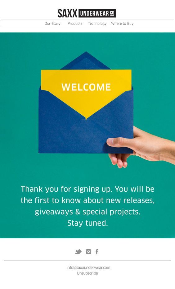The SAXX Underwear welcome email is a reminder of the old days of mailing postcards. The point-of-view shot makes you feel like holding the envelope yourself.