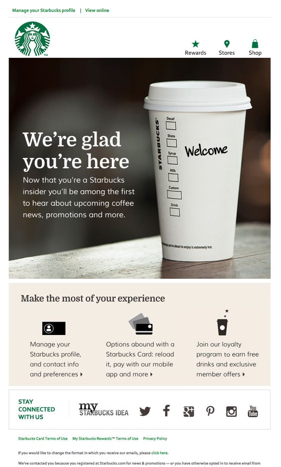 A Welcome email to all Startbucks coffee insiders. A large image with a clear message and three quick links underneath: manage your account; get a Starbucks card; join the loyalty program.
