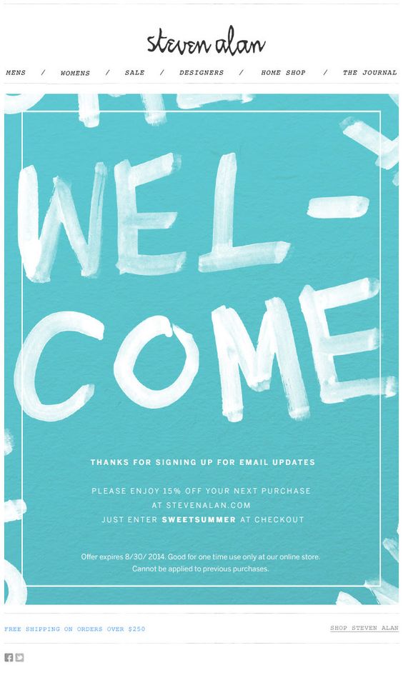 Here is a perfect welcome email that says it all. You have signed up with Steven Alan and you are notified with a clear message. Plus, you will enjoy 15% off your next purchase. Nice touch!