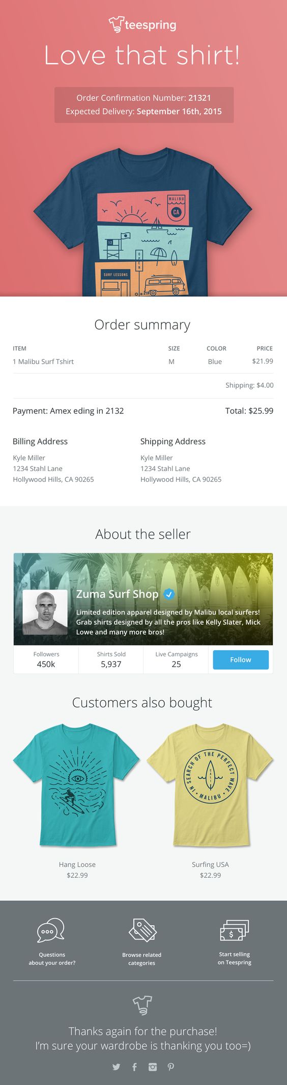 A lovely Teespring order confirmation email with the purchased product on top and payment information underneath. The email also shows some seller information and a couple of recommendations for similar products.