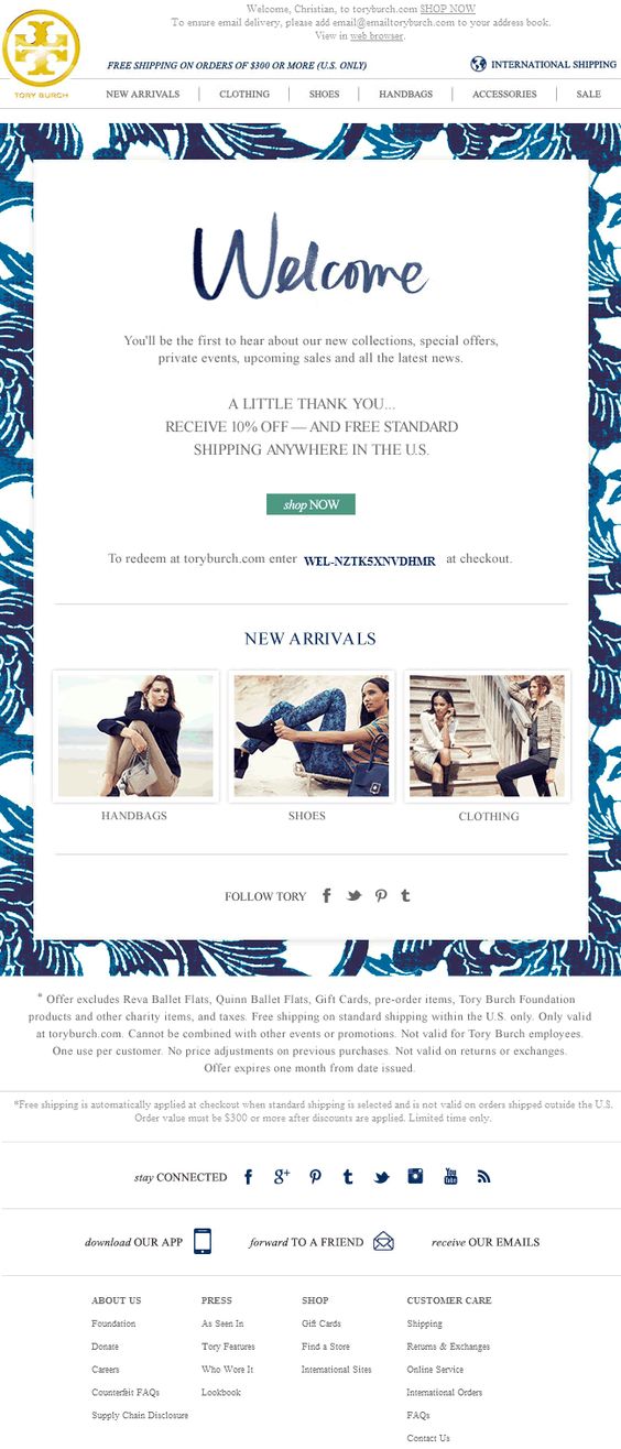 Tory Burch welcomes their clients in style. The welcome message is placed in a beautiful, blue frame and complimented by a little thank you gift – 10% off your purchase.