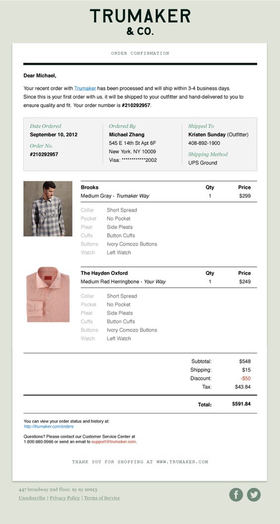 The Trumaker order confirmation email displays a layout for two products, client details confirmation section and no marketing messages at all. This is a very good example of transactional email for order confirmation.12. Teespring