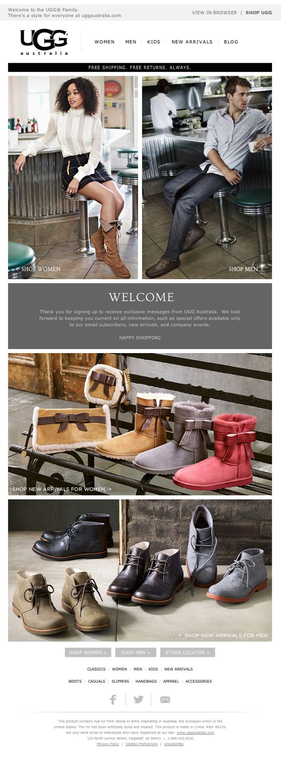 UGG welcomes their clients with this beautiful email. You still see the welcome message clearly in the centre of the email, but there are also a lot of product examples around it.