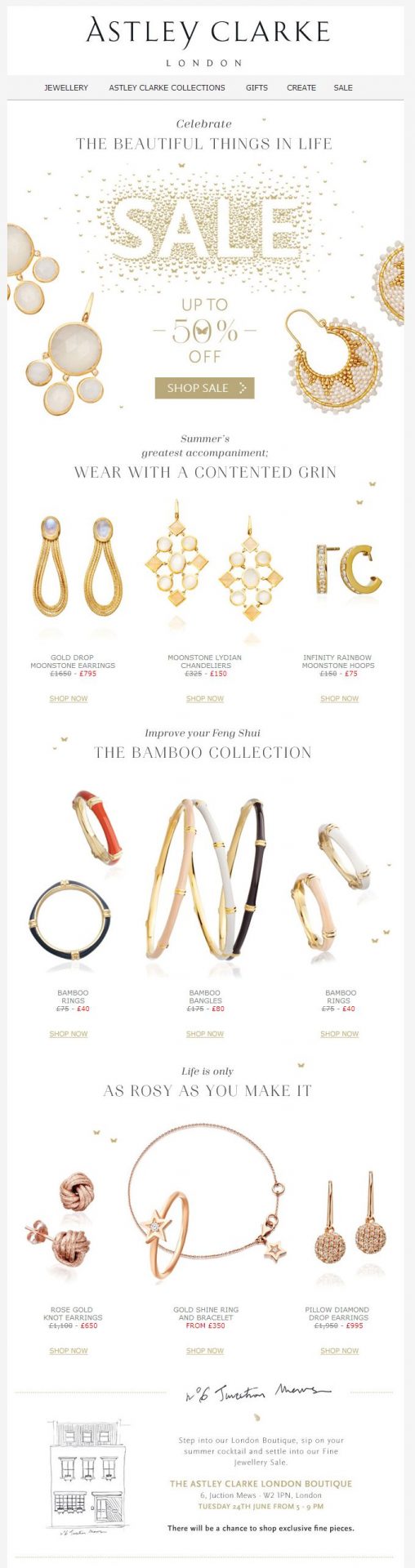 Astley Clarke is a boutique in London that sells all kinds of jewelry and they have chosen the color scheme of their newsletter to be white and gold. This scheme helps the products and call to actions stand out more and catch the subscriber’s attention .They have also spelled out the word “SALE” in a very creative way using tiny gold butterflies.