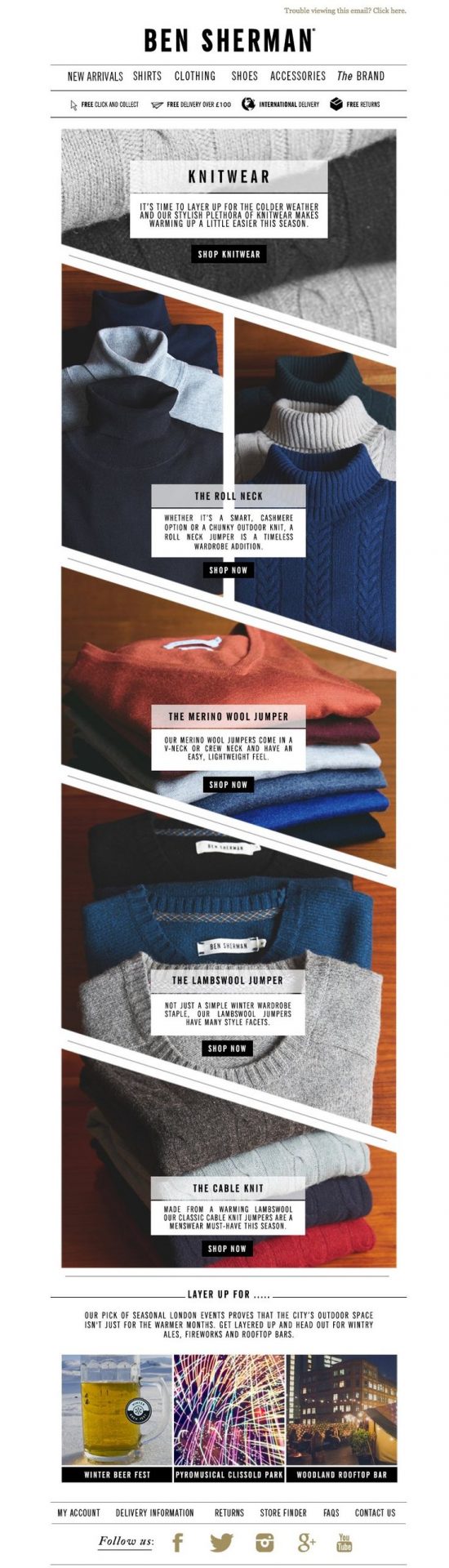 This Ben Sherman newsletter really shows off each of their knitwear category with interesting image placeholder shapes and a little information about them.