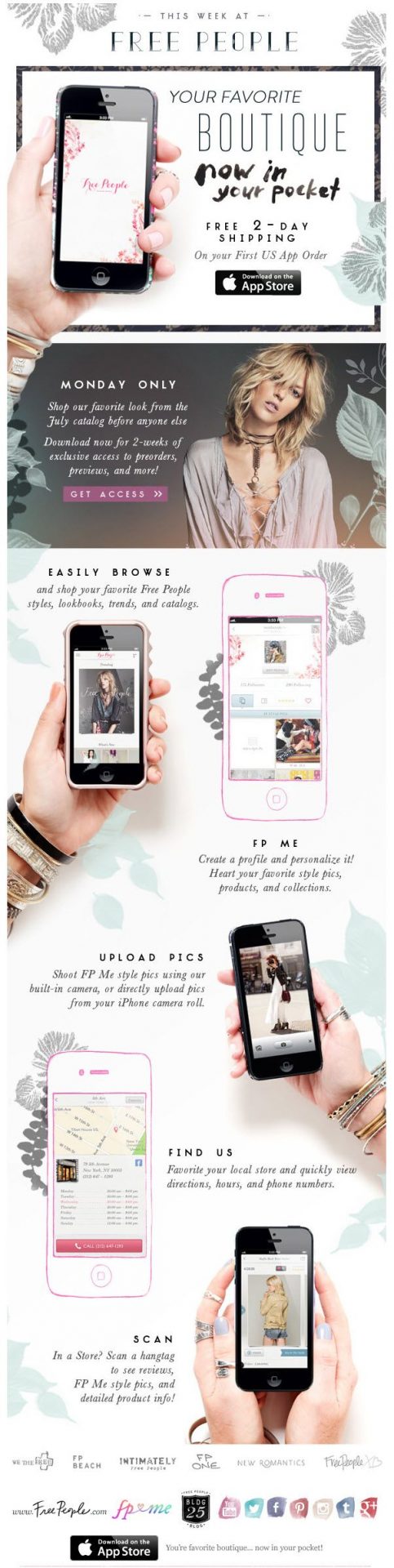 With this newsletter, the boutique Free People is advertising their newest store app with the headline “Your favorite boutique…in your pocket”. They have used pictures of people’s hands holding iPhones as a way to showcase the interface and features of the app.