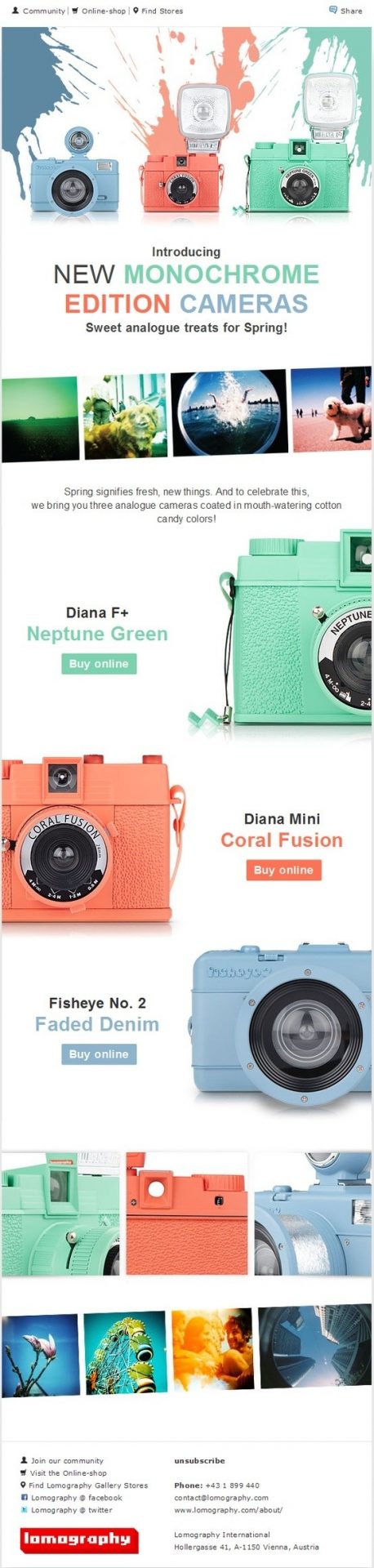 Lomography’s email newsletter is very clean and clear and pretty much lets the vibrant colors do all the “talking”. The red, blue and green cameras really stand out and capture the subscriber’s attention. They have also added some nice carousels of pretty images in the form of a film tape.