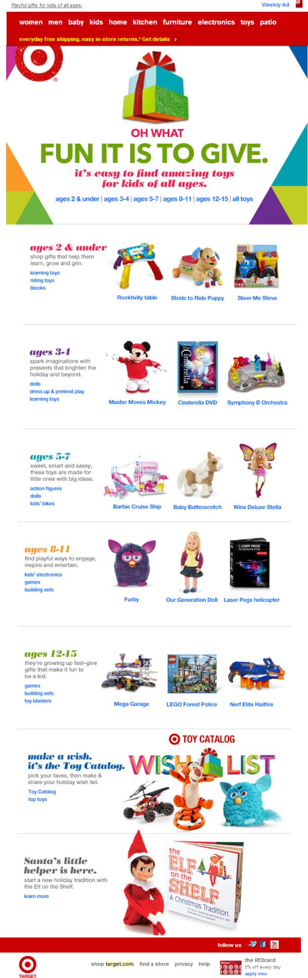 This Target email newsletter has both primary and secondary CTAs that allows subscribers to shop by age and product categories within those age brackets. They have used vibrant colors for these CTAs and other text in order to make them stand out more.
