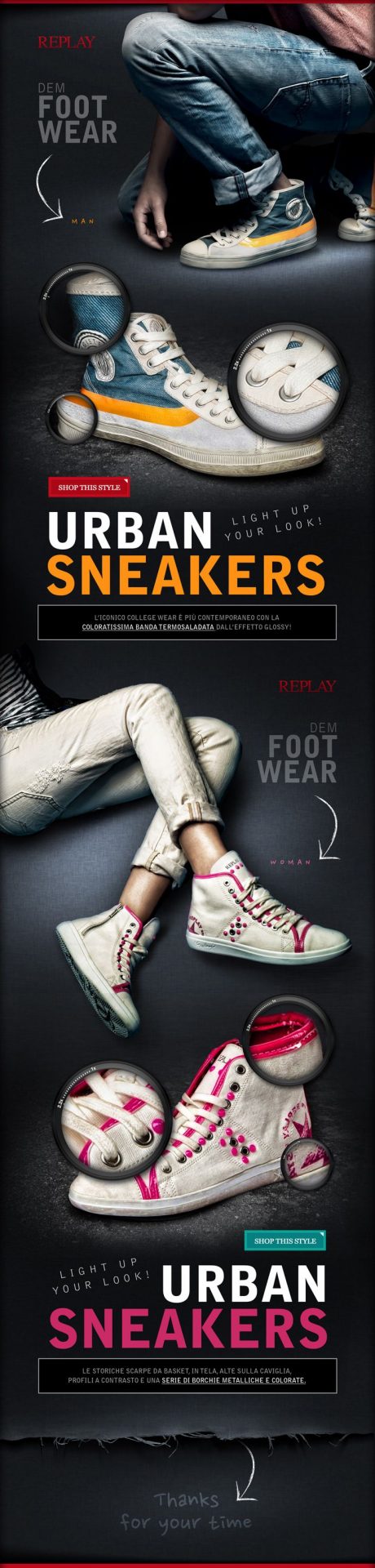 Urban Sneakers uses a pretty unique and unconventional design for their newsletter. They may not have included much information about the products, but the images in which the sneakers are highlighted, clearly catch the reader’s eye.
