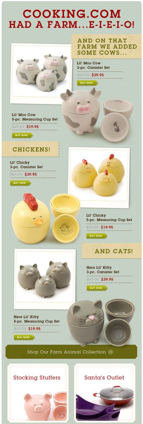 This newsletter is also unusual, but effective nonetheless. It showcases little measuring cups in the form of adorable farm animals, which of course explains the witty titles. The big images really focus the subscriber’s attention on the product itself and the green Buy Now buttons.