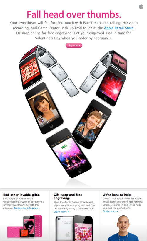This newsletter brings imaginative use of beautiful graphics into play along with many iPhones that are placed in the shape of a heart in order to embody the love that we all have for the device.