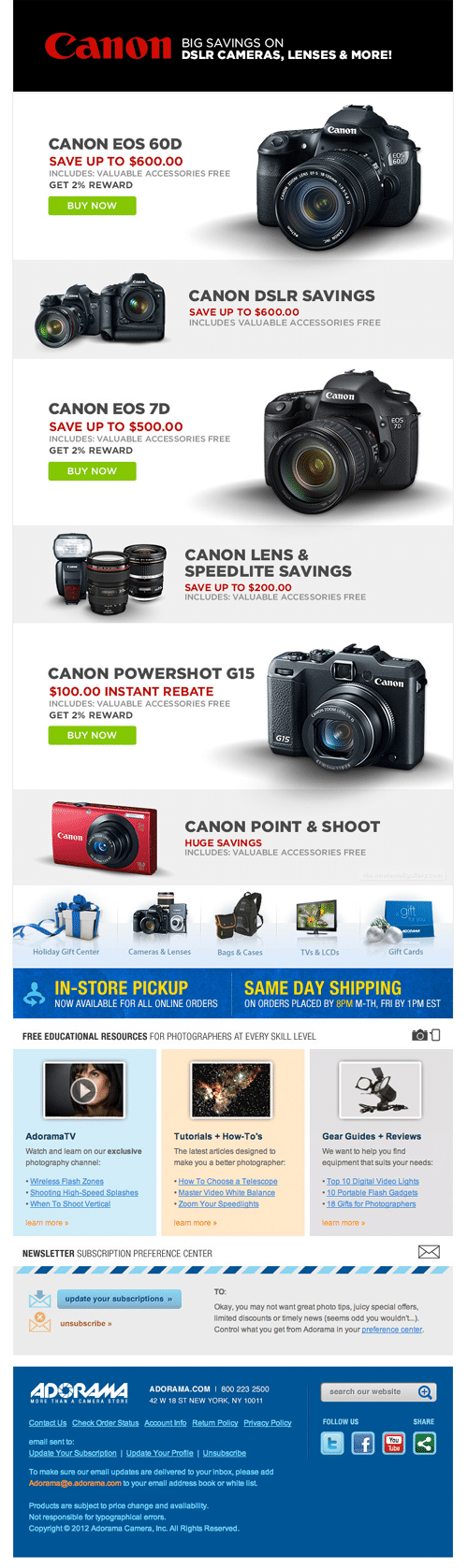Canon’s newsletter is very clean and uses bright colors such as red for the text and green for the call to actions, to make them stand out more. Then we have each product either on the left side of the newsletter or the right. Simple, clear and informative.