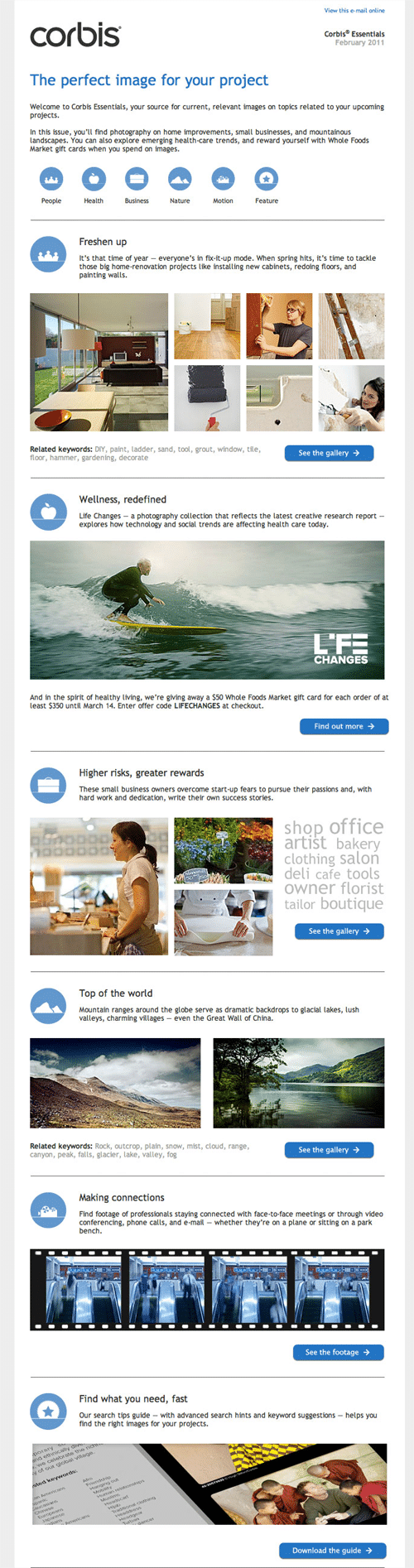Corbis’ newsletter design is very clean and clear in a white and blue color scheme. They have also included various categories in the beginning of the newsletter that act as a map legend of sorts. They have done this, because each article in the newsletter seems to belong to a different category. This helps the readers distinguish between them.