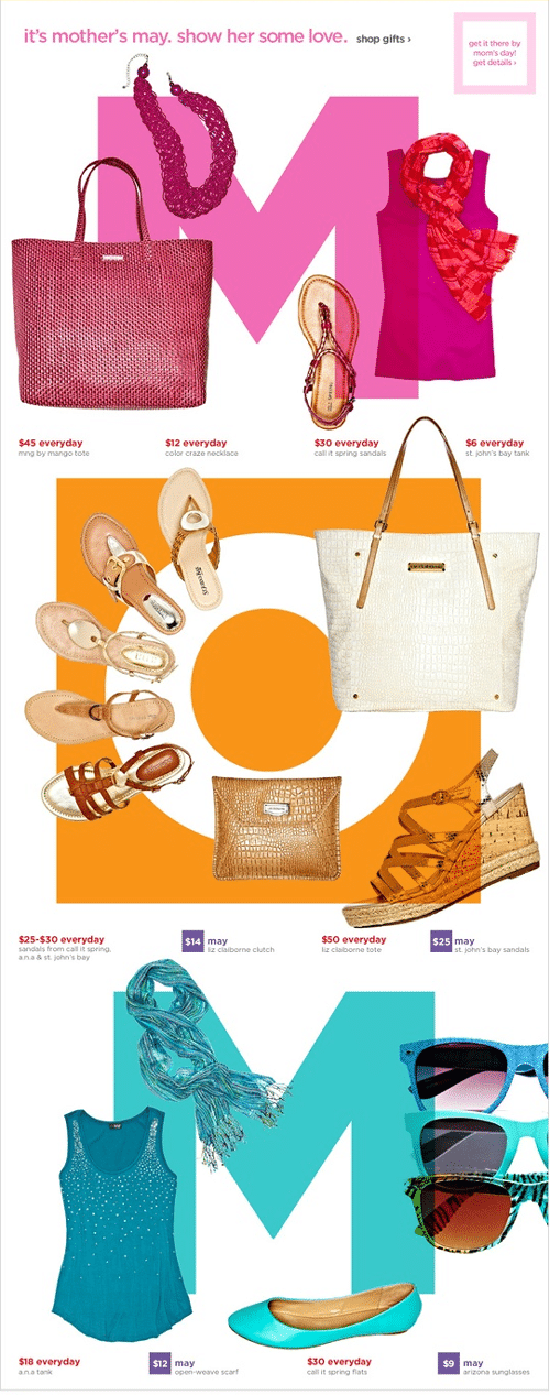 JCP’s special mother’s day newsletter uses typography and vibrant colors to really stand out and catch the eye of subscribers. They have spelled out the word “mom” in different colors and on each letter there are products such as tank tops, shoes and accessories matching that theme.