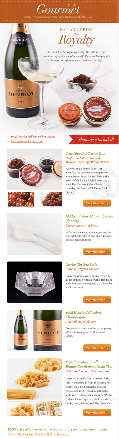 Lot 18 offers exclusive access to the finest wines and artisanal selections. Their newsletter uses an orange and red color scheme to make the images of the wines and other products, along with the call to actions stand out.