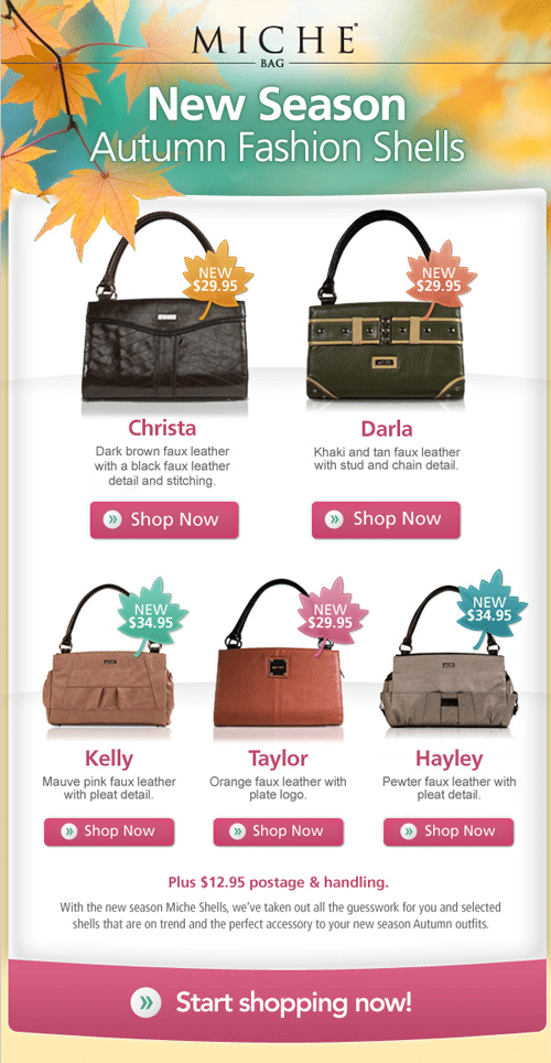 This is a well suited template design for a newsletter that offers exciting deals about handbags. The design has a very autumn look and feel thanks to the colors and multiple leafs all over the template.