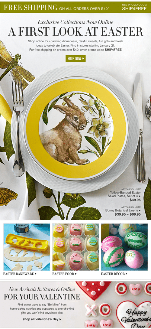 Williams-Sonoma’s newsletter for their Easter collections of charming dinnerware, playful sweets, fun gifts and ideas for the holiday focuses mainly on the images of the products. It doesn’t have a lot of text, but doesn’t really need it either. This is another instance of having just enough information to get the reader interested in finding out more in their website.