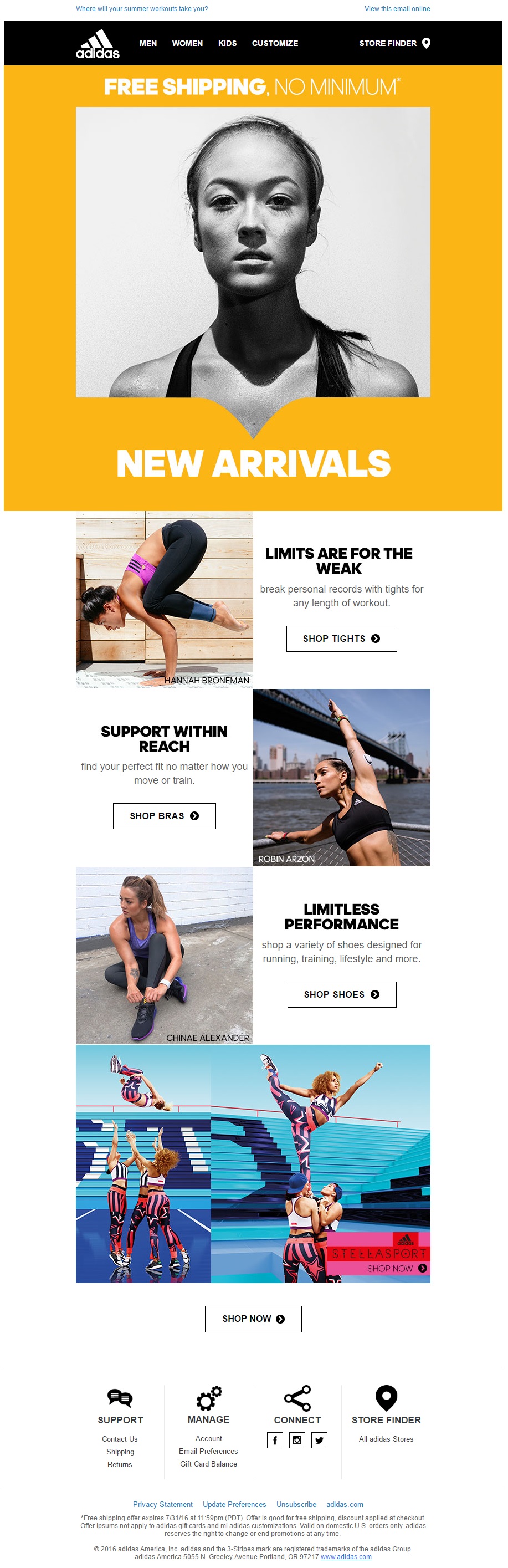 With this email template Adidas presents their new ladies collection. On top they confirm that there is no minimum purchase required to avail of the free delivery. Then we have three rows of images and links following a checkers board pattern. The call to actions are clear and match the images next to them.