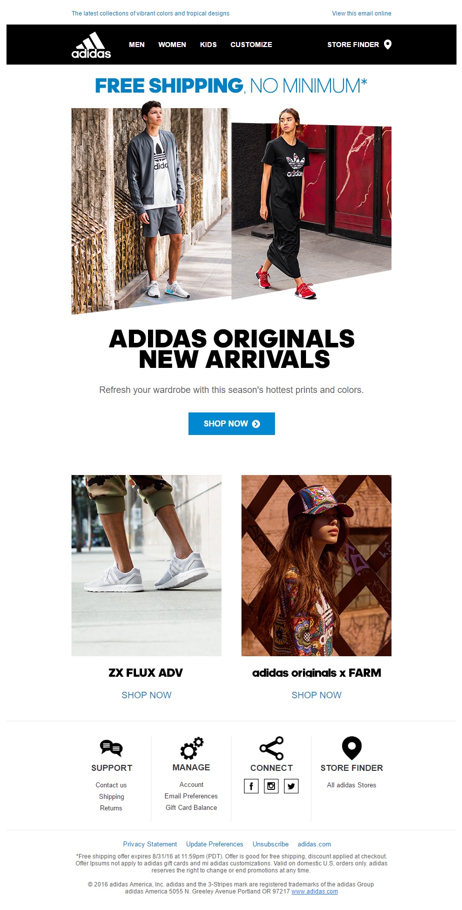 Adidas, the German sportswear company, presents its new Originals collection with this email. They have top navigation menu for quicker access to the four main sections on their website. The images are spaced well and there is a clear call to action in contrasting blue in the middle of the email.