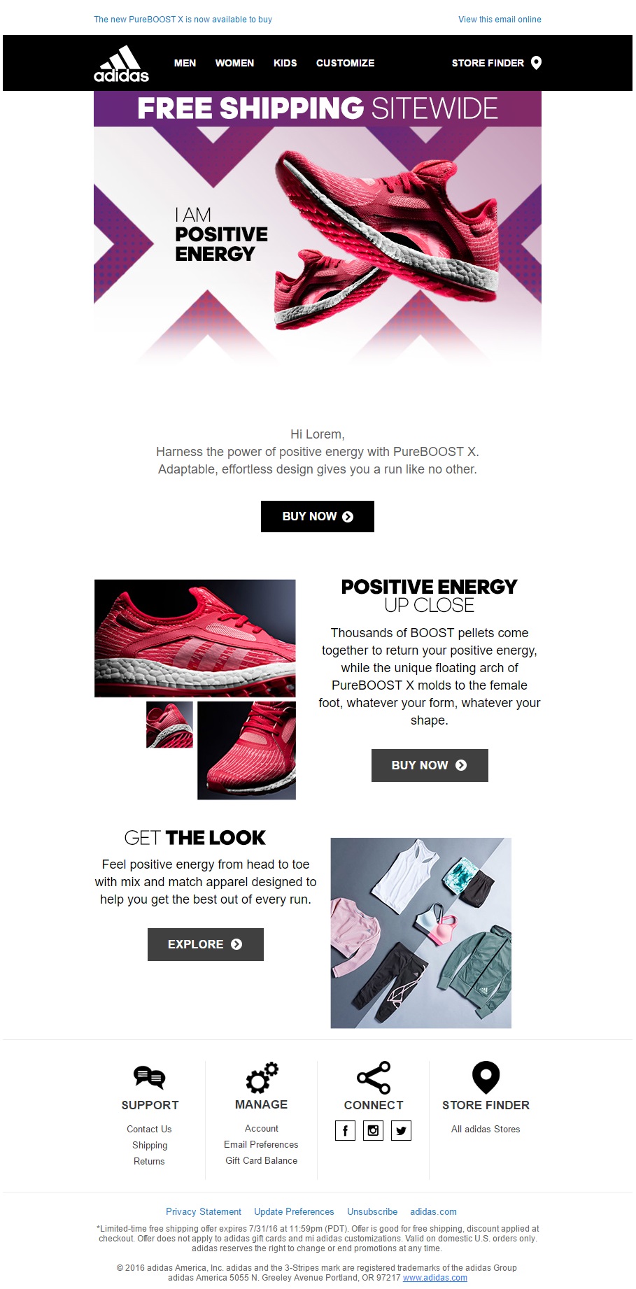Another email for the ladies from Adidas. The color scheme features pink and purple, with the graphics’ colors matching those of the product. Again the calls to action are clear and contrasting to the white background. The email focuses on the promotion of a single product featured in the hero image.