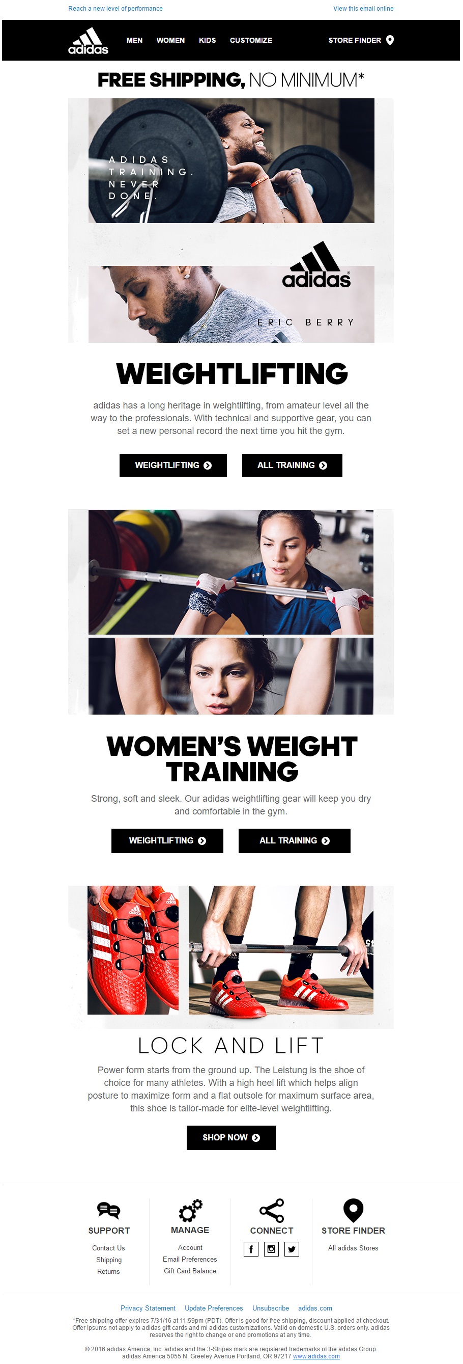 Adidas focuses on a particular client segment with this email. The reader is informed about the topic of the email with a clear hero image and big, bold title. The color scheme is black and white and the email features clear links to the website.