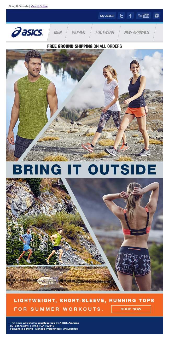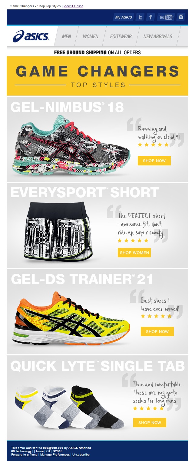 Asics scores a winner with this one. This is a very product-focused message. Four big images of the best summertime, running products or “top styles” as Asics call them. The email is very intuitive, the four products are like big, colorful icons, just hit the one you like.