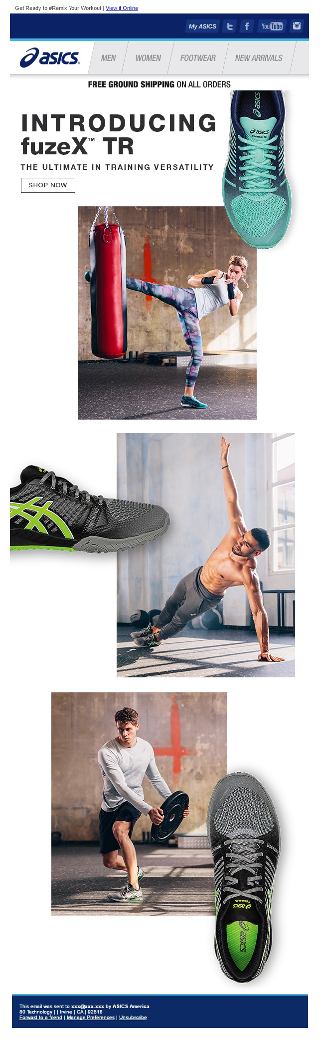 Another email from Asics focusing on a single product, instead of collection. The trainers in question are featured in three separate training situations, which is to say that they are multi-purpose training shoes. They come in different colors and offer models for both men and women.